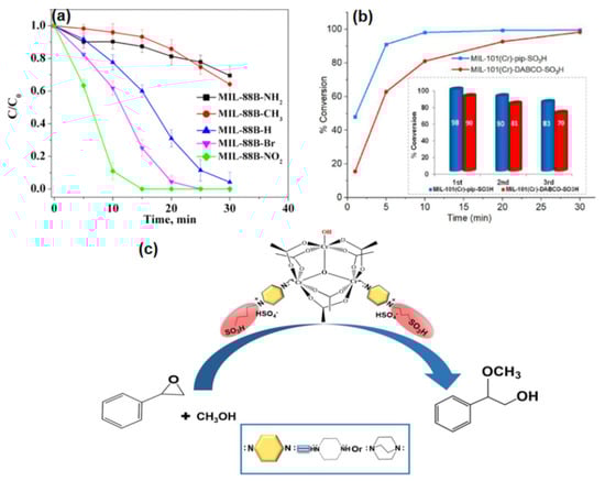 In the study on ligand modification of MILs, few other ligands appeared, and only a few ligands showed excellent degradation properties when combined with parent materials. Gao et al. synthesized MIL-88B(Fe)-X (X=NH2, CH3, H, Br, and NO2) and used the addition of ligands to reduce the electron density in the reaction for solving the problem of slow Fe(III) reduction in the Fenton system (Figure 8a) []. The results showed that MIL-88B(Fe)-NO2, with the substituent of highest electrophilicity among these catalysts, had an excellent performance in the degradation of phenol. In addition, -SO3H can also make a contribution to the production of Brønsted acid sites and Lewis acid sites for enhancing the degradation efficiency. SO3H-MIL-101(Cr) was prepared for the conversion of oleic acid (94.3%) with the synergistic effect between Brønsted acid and Lewis acid. Mortazavi et al. used MIL-101(Cr) to construct MIL-pip-SO3H and MIL-DABCO-SO3H (Figure 8b,c) []. As a Brønsted solid acid catalyst, MIL-pip-SO3H and MIL-DABCO-SO3H were good at degrading styrene oxide and better than any Lewis acid catalysts that have been reported. In general, there are few studies on modifying MILs in the Fenton system by ligands other than -NH2, which we can work on in the future.