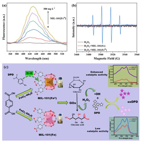 (a) Fluorescent measurements, (b) EPR measurement of •OH, and (c) Colorimetric determination of H2O2 and glucose based on MIL−101(FeII) catalysis [].