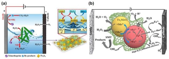 However, due to the leaching and decrease of active sites, the regeneration of unsaturated sites slows down with the progress of the electro-Fenton reaction. Therefore, it is usually considered to use a high-pore catalyst for improvement. Priyadarshini et al. successfully synthesized MIL-53(Fe)@Fe3O4@C for degradation of salicylic acid in water in an electro-Fenton system []. Ye et al. synthesized MIL-88B(Fe)/Fe3S4 hybrids via a facile sulfurization to treatment trimethoprim (TMP) in the heterogeneous electro-Fenton (HEF) system (Figure 11a) []. The hybrid molecular orbitals of S-Fe improved the absence of coordinated unsaturated sites in the electro-Fenton system of conventional MIL-88B(Fe), which brought a larger expansion room to release the overlapping orbital parts between iron sites and H2O2. Consequently, it promoted the reaction’s electron transfer from H2O2 to Fe(III). The result showed that the reaction system removed TMP quickly at mild pH. It also confirmed that MIL-88B(Fe) sulfidation could enhance the catalyst activity. In addition, the absence of catalyst active sites and weak electron transport in the electro-Fenton system could be solved by metal–carbon hybrids and the introduction of the other metal. Du et al. prepared MIL-53(Fe)@MoO3 to degrade sulfamethazine (SMT) and studied the corresponding pyrolysis catalysts involving FeMo-based bimetallic and porous carbon (PC) (FeMo@PC) (Figure 11b) []. The addition of PC enhanced the electron transfer in the system and accelerated the synergistic effects among Fe, Mo, and carbon, which caused the FeMo@PC-2 (MoO3 with 30.0 mg) to exhibit excellent performance for SMT removal.