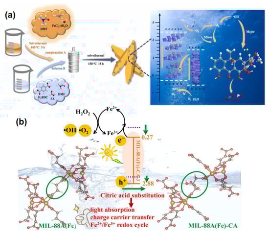 The photo-Fenton reaction system uses ultraviolet wavelength radiation to enhance the oxidation ability of the Fenton reagent, thus accelerating the degradation of organic pollutants [,]. The advantages of photocatalysis and Fenton-like technology grant MILs a wide range of applications in the field of photo-Fenton. The photo-Fenton system is considered one of the most promising processing technologies because it is easy to operate without high temperature and pressure []. Zhang et al. designed a novel catalyst a-Fe2O3/MIL-53(Fe), which had the advantages of thermodynamic stability of a-Fe2O3, appropriate bandgap width, and the synergism of atom/MOFs catalyst (Figure 12a) []. At the same time, forming a heterojunction structure reduces the band gap, strengthens visible light’s absorption ability, and improves photocarrier transmission. a-Fe2O3/MIL-53(Fe) hydrochloride showed excellent degradation performance of Tetracycline hydrochloride (TC-HCl) in the photo-Fenton system. Li et al. used CA to modify MIL-88A(Fe) for degrading methylene blue (MB) and carbamazepine (CBZ) (Figure 12b) []. The modification of CA could accelerate the separation and transfer of photo-charge and optimize the Fe(II)/Fe(III) cycle, thus improving the catalytic performance. The photocatalytic rate of the improved material is up to 6.5 and 2.5 times higher than that of the raw material. Moreover, the catalyst shows excellent stability and repeatability. We have compared many photo-Fenton systems by MILs in Table 3 with their target compound, removal efficiency and conditions as well as the SBET area of MILs.