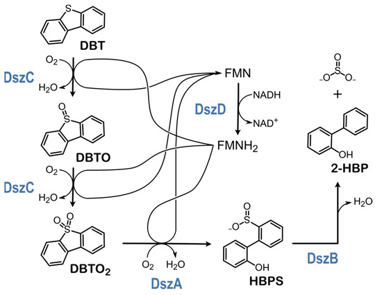 For a few decades now, the 4S pathway of the bacterium Rhodococcus erythropolis (strain IGTS8) has been studied as a potential biodesulfurization tool [18,19,20]. The 4S pathway encompasses four enzymes and uses dibenzothiophene and its derivatives in sulfur-rich crude oil as a substrate to store energy in aromatic carbon skeletons. The metabolism of DBT consumption by the bacterium, depicted in Figure 1, requires the action of two FMNH2-dependent monooxygenases, DszA and DszC, the desulfinase DszB and the NADH-dependent FMN oxidoreductase, DszD; and produces 2-hydroxybiphenyl (2-HBP) and sulfite (SO32−).