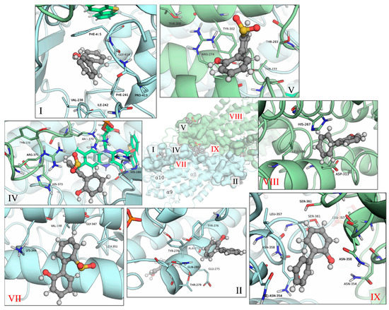 The sites where 2-HBP and HBPS bound most of the time. The residues with contacts within 3.5 Å of 2-HBP and HBPS are labeled and shown in stick representation. Binding sites that differ from the predicted in the docking calculations are labeled red (VII, VIII, and IX).