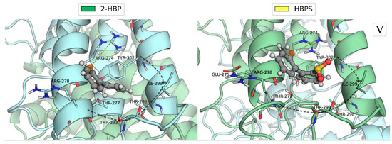 Most consensual binding site: binding site V. No binding site filling the four requisites was found, but one filled most criteria. The binding site V, composed of residues Arg274, Thr277, Arg278, Thr293, Thr298, Ile299, and Tyr302, was observed to interact with both 2-HBP and HBPS in all but one simulation through short contacts often lasting > 60% of the time (Figure 2 and Figure S7–S10). Furthermore, it bound more often HBPS than 2-HBP, which is consistent with the higher inhibitory effect of HBPS suggested by experimental IC50 (15 μM vs. 50 μM of 2-HBP) [23]. Finally, the binding site is located right by the Gln280-Asp295 lid loop, which, together with the adjacent Ser131-Lys142 loop, promotes the proper binding of the FMN cofactor required for DszC activity [38,40].