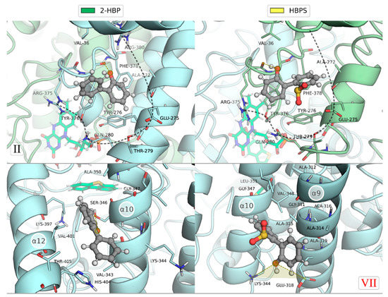 Figure 5 depicts a representative mode of interaction for 2-HBP and HBPS at binding sites II and VII, obtained from the clustering of the simulation in which the binding sites registered the highest occupation, following the RMSd of the residues composing each binding site.