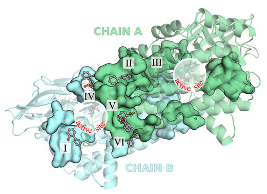 Aside from the binding site VIII (located at the surface of each DszC monomer), binding sites II, V, and IX are close to regions that might contribute to the dimerization of DszC. In particular, site V includes residues right next to the Gln280-Asp295 residues composing a flexible lid loop, which is proposed to be involved in the open/closed-conformation interchange required for DszC activity [38,40] alongside site II, which includes residues at the N-terminus of the lid loop (Ala272-Gln280) and the C-terminus of α11-helix (Tyr376-Arg380). Finally, the binding site IX lies well at the dimerization interface of the homodimer required for a catalytically-competent form of the enzyme.
