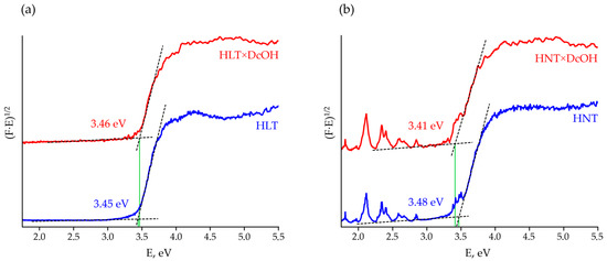 Tauc plots for the initial protonated forms and n-decoxy derivatives of HLT (a) and HNT (b) titanates.