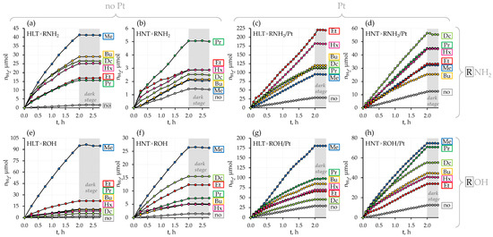 Kinetic curves of photocatalytic hydrogen evolution over the initial protonated titanates, their n-alkylamine (a–d) and n-alkoxy (e–h) derivatives in a bare state and with a Pt cocatalyst from 1 mol. % aqueous methanol under near-ultraviolet irradiation. Grey background corresponds to the dark stages (irradiation source is turned off).