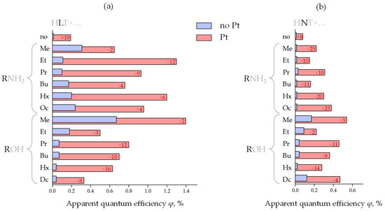 Apparent quantum efficiency of photocatalytic hydrogen evolution over the initial protonated forms and inorganic–organic derivatives of HLT (a) and HNT (b) titanates in a bare state and with a Pt cocatalyst as well as platinization increase factors kPt.