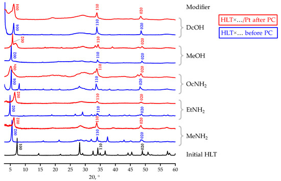 Since some inorganic–organic derivatives of the related n = 3 titanates H2Ln2Ti3O10, considered in our previous report [81], were found to experience practically complete decomposition of the interlayer organic components during photocatalytic hydrogen generation, similar chemical instability would be expected from the HLT-based samples. However, the n = 1 titanates in question turned out to demonstrate significantly greater stability of the interlayer organics under photocatalytic conditions. XRD patterns of the samples separated after photocatalytic measurements (Figure 5) differ from those of the initial compounds by the shift of the (00x) reflections to larger 2θ angles (HLT×MeNH2, HLT×EtNH2), their widening (HLT×OcNH2, HLT×DcOH) or formation of by-phases (HLT×MeOH). These structural transformations may be caused by the partial degradation of inserted organic modifiers, samples’ disordering along the c crystallographic axis upon the organic withdrawal, and additional hydration of the interlayer space, respectively. Having said so, unlike the H2Ln2Ti3O10-based samples, none of the HLT inorganic–organic derivatives turns structurally into the protonated titanate, which points to at least partial preservation of the interlayer organic components in the course of photocatalysis.
