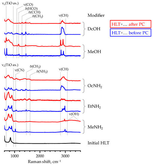 This fact is fully consistent with the Raman spectra of the final samples (Figure 6) that clearly indicate the presence of organic modifiers in their matrix. However, the relative intensity of some bands diminishes after photocatalytic experiments, which is more pronounced in the case of HLT×EtNH2, HLT×OcNH2 and HLT×DcOH and, apparently, is associated with a decrease in organic content in these samples. At the same time, HLT×MeNH2 and HLT×MeOH taken after photocatalysis show intense vibrational bands of the interlayer organics, comparable with those in the spectra of the initial materials. In accordance with the results of quantitative CHN-analysis, HLT×MeNH2 and HLT×MeOH indeed preserve a vast majority of the organic modifier in the course of photocatalytic measurements: the former contains 0.3 residual methylamine molecules per formula unit (initial content 0.35) and the latter includes 0.5 methoxy groups per formula unit (initial content 0.7). However, the organically modified titanates with longer organic chains (HLT×EtNH2, HLT×OcNH2, HLT×DcOH) appear to preserve only approximately 0.1 organic units per titanate formula whilst the initial content is 0.35–0.45. The estimated compositions of the final samples are in good consistency with total mass losses observed in their TG curves (Figure S7). Being analyzed after photocatalysis, the organically modified titanates exhibit a significantly less pronounced mass gain in the temperature range above 450 °C that is interpreted as partial oxidation of the residual carbon in the sample [73]. This fact points to the probable weakening of the bond between the perovskite matrix and organic component during photocatalysis, which allows the residual organics to liberate at lower temperatures.