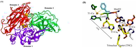 Crystal structure of the laccase (LccI) (PDB code: 1GYC) in Trametes versicolor. (A) The overall structure of LccI; (B) structure of the schematic representation of the four copper sites in LccI.