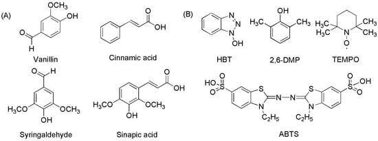 The chemical structures of several artificial and natural redox mediators in laccase-catalyzed oxidation reaction systems. (A) natural redox mediators; (B) artificial redox mediators.