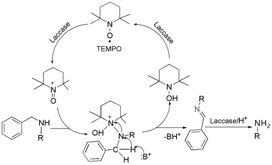 Due to the abundance of amines in organic molecules, the employment of amino-protecting groups is commonplace in many synthetic schemes, such as carbamates, amides, and sulfonamides [66]. The chemical method is generally used to remove the amino-protecting groups and has the disadvantages of high price, harsh reaction conditions, and severe pollution [66,67,68,69]. The N-para-methoxyphenyl (N-PMP) and N-benzyl group could be removed in an aqueous solution with the oxidative fracture of the C–N bond catalysis by laccase [41].