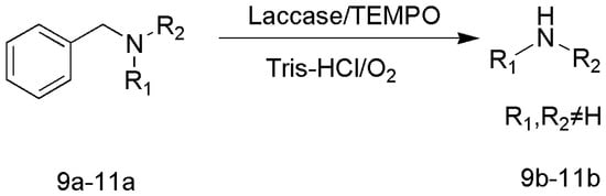 N-Benzyl groups are typically cleaved using reductive methods, often employing palladium-catalyzed hydrogenolysis [72], which is accompanied by high cost, poor reaction conditions, and severe pollution. Reports have indicated that laccase from Trametes versicolor and TEMPO catalyzes the debenzylation of n-benzyl-1-phenylethylamine to α-phenylethylamine at 30 °C, pH 5, and O2 (Scheme 2, Table 3) [40]. This methodology could be successfully applied over different aliphatic, cyclic, and aromatic amines affording deprotected derivatives of 1a–7a smoothly and immaculately, with no undesired by-products or oxidative transformations (Conversion > 97%). In contrast to the high cost, poor reaction conditions, and severe pollution of palladium-catalyzed hydrogenolysis, laccase-catalyzed N-benzyl removal is accompanied by mild reaction conditions, pollution-free, and easy extraction of the final derivatives.