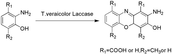 - Osiadacz, J.; Al-Adhami, A.J.; Bajraszewska, D.; Fischer, P.; Peczyñska-Czoch, W. On the use of Trametes versicolor laccase for the conversion of 4-methyl-3-hydroxyanthranilic acid to actinocin chromophore. J. Biotechnol. 1999, 72, 141–149. [Google Scholar] [CrossRef]