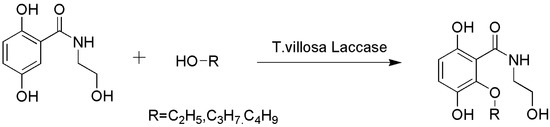 - Manda, K.; Gördes, D.; Mikolasch, A.; Hammer, E.; Schmidt, E.; Thurow, K.; Schauer, F. Carbon-oxygen bond formation by fungal laccases: Cross-coupling of 2, 5-dihydroxy-N-(2-hydroxyethyl)-benzamide with the solvents water, methanol, and other alcohols. Appl. Biochem. Microbiol. 2007, 76, 407–416. [Google Scholar] [CrossRef] [PubMed]