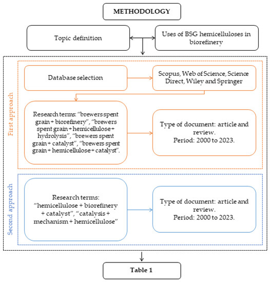For this review, we initially searched the Web of Science (WoC), Science Direct, Scopus, Wiley, and Springer databases with the terms “brewer’s spent grain + biorefinery”, “brewers spent grain + hemicellulose + hydrolysis”, “brewers spent grain + catalyst”, and “brewers spent grain + hemicellulose + catalyst”. Then, to broaden the scope, we added the terms “hemicellulose + biorefinery + catalyst” and “catalysis + mechanism + hemicellulose” to the search, exploring the possibility of methods applied to other biomasses of a similar structure applying to BSG hemicelluloses processing (Figure 1).