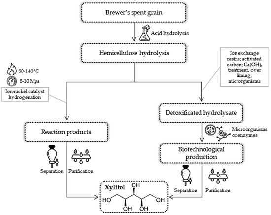 - Mussatto, S.I.; Roberto, I.C. Acid Hydrolysis and Fermentation of Brewer’s Spent Grain to Produce Xylitol. J. Sci. Food Agric. 2005, 85, 2453–2460. [Google Scholar] [CrossRef]