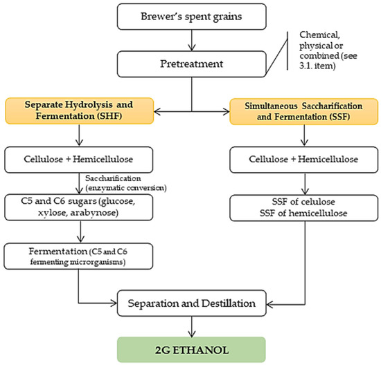 At first, only the cellulosic part of the biomass (predominantly glucose) was subjected to fermentation due to the incapacity of the traditional industrial yeasts (usually Saccharomyces cerevisiae industrial strains, such as PE-2) to convert pentoses (such as xylose and arabinose, the main constituent monomers of hemicellulose) into ethanol once they do not harbor an efficient xylose assimilation pathway [84]. However, the use of native yeasts capable of fermenting xylose, such as Scheffersomyces stipitis and Scheffersomyces shehatae (that can ferment both glucose and xylose) [55], and the genetic engineering of S. cerevisiae strains to include this xylose assimilation pathway, as well as fermentation inhibitor tolerance [85], have made it possible to use pentoses from lignocellulosic biomass in 2G ethanol production, which includes BSG, in addition to possibly reducing costs associated with the removal of the detoxification step of the hydrolysates.