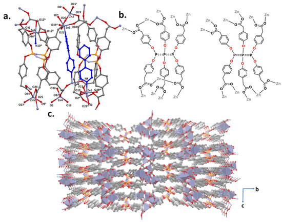 The reaction of ZnCl2 with H6L1 under conventional conditions at 80 °C resulted in a 3D coordination polymer, namely {[Zn6(L)2(4,4′-bpy)2]}n. The asymmetric unit of GTU-3 consists of six crystallographically independent Zn2+ ions, two fully deprotonated cyclophosphazene-based ligands, and two 4,4′-Bipyridine (4,4′-bpy) (Figure 4a). GTU-3 crystallizes in the monoclinic crystal system with P21/n space group. Regarding the hexacarboxylated cyclophosphazene ligands, three of the six-carboxylate arms are situated above the central heterocyclic ring, and the other three below. Zn1 and Zn6 central atoms have similar coordination environments and are distorted square pyramidal coordination geometry composed of four carboxylate oxygen atoms (O2, O10, O25, O28 for Zn1; O12, O15, O31, O36 for Zn2) and one nitrogen atom of 4,4′-bpy (N4 for Zn1; N10 for Zn6). Zn2, Zn4, and Zn5 ions are four-coordinate through four carboxylate oxygen atoms to give distorted tetrahedral coordination geometry. Zn3 ion is a distorted tetrahedral geometry by three carboxylate oxygen atoms and one nitrogen atom of 4,4′-bpy. The Zn-Ocarboxylate bond distance is in the range of 1.919 (5) Å-2.136 (6) Å, comparable to reported bond lengths in other N3P3-based hexacarboxylated Zn complexes [20]. As indicated in Figure 4b, there are two fully deprotonated cyclophosphazene-based linkers with different coordination modes in the crystal structure. The one cyclophosphazene linker adopts a μ10 coordination binding mode, in which carboxylate groups have three syn-syn-μ2-η1:η1 and three syn-anti-μ2-η1:η1 binding modes, while the other linker in the asymmetric unit has a μ11 coordination binding mode involving five syn-syn-μ2-η1:η1 and one syn-anti-μ2-η1:η1 coordination mode (Figure 4b). On the other hand, the nitrogen atom in one of the two bipyridine ligands does not participate in coordination. In Figure 4c, an image of three-dimensional coordination polymer by a-axis is shown. The P-N distances in GTU-3 are typically in the range of 1.565 (6) Å–1.598 (6) Å and the average N-P-N and P-N-P angles are 117.25° and 121.65° [21,22].