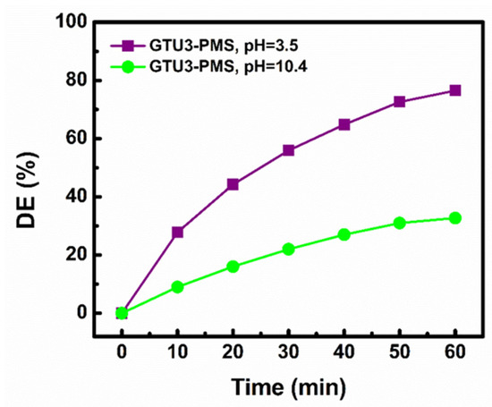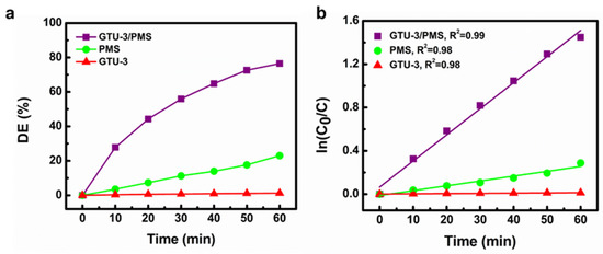 It was assumed that the degradation process obeyed pseudo-first-order kinetics, and the ln(C0/C) graph was plotted versus time (Figure 6b). The linear plots with high R2 values proved this assumption to be true. Therefore, the slope of the obtained trendline could be considered as the reaction kapp. Applying this kapp, the synergistic effect (SE) between the simultaneous presence of GTU-3 and PMS could be calculated using the following equation (Equation (1)) [23]: