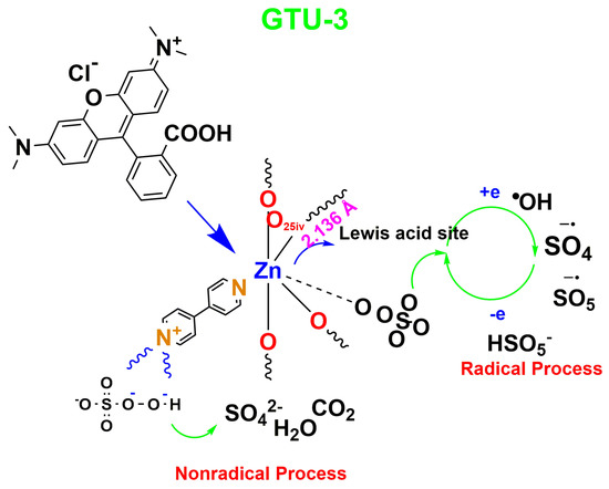 The Lewis acid site of the surface is involved in the catalytic oxidation of metal oxides. Abundant H2O molecules are adsorbed to the surface of the metal oxide catalyst when it is added to an aqueous solution. Water molecules split apart to form OH− and H+, which combine with surface metal atoms and oxygen-containing sites, respectively, to form surface hydroxyl groups. The metal oxide’s hydroxyl group is visible as a Bronsted acid point. Unsaturated covalent oxygen atoms and metal cations exhibit Lewis acid and Lewis basic points, respectively [24]. In addition, it is assumed that RhB degradation occurs via two parallel mechanisms, radical and nonradical mechanisms [25]. The longer M…O bond can be considered a weak coordination bond [26]. The weak carboxylate M…O coordination with the corresponding metal center can act as an active Lewis acid site. For GTU-3, the carboxylate bond lengths were measured as 2.136 Å (Zn1…..O25iv), which supports the weak carboxylate bonding. Consequently, the metal core and weak carboxylate coordinations can act as active Lewis acid centers with the potential to initiate a catalytic reaction by attacking the PMS oxidant molecule from the O end. This process can lead to the production of SO4•− radicals according to the following reactions (Equations (2) and (3)), which consequently starts the radical process [27].