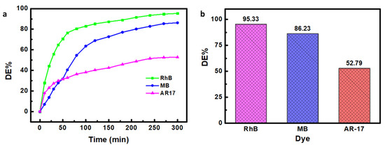 (a) Catalytic degradation efficiency of GTU-3 at the dye initial concentration of 10 mg/L (50 mL), [PMS] = 0.5 mM, and GTU-3 = 0.4 g/L, and (b) the bar graph of the dyes degradation.