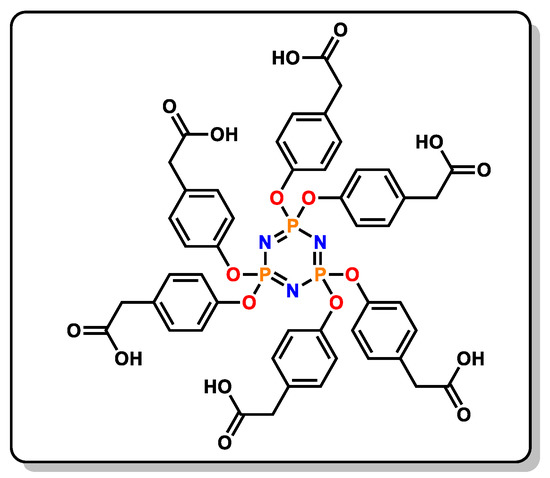 Anhydrous potassium carbonate (2.77 g, 20.09 mmol) was poured into an anhydrous acetone (50 mL) solution, which contained methyl 4-hydroxyphenylacetate (3.3 g, 20.09 mmol) and phosphonitrilic chloride trimer N3P3Cl6 (1.00 g, 2.87 mmol) and was heated in reflux conditions for 36 h while being stirred constantly under an argon atmosphere. The reaction solvent was removed with a rotary evaporator after being cooled to room temperature. To extract the obtained solid compound, 50 mL of water and DCM was used. Then, anhydrous Na2SO4 was added to dry the organic phase. For purifying the obtained unpurified product, it was passed through a silica gel chromatography column, with Hexane:THF (3:2) as the mobile phase. After drying the product (N3P3(OC6H4CH3COOCH3)6), a white powder (2.8 g, 80% yield based on N3P3Cl6) was obtained. MALDI-TOF (m/z) Calc. 1125.26 m/z, Found: 1126.078 [M + H]+ (Figure S4, in the Supplementary Materials). 1H-NMR (400 MHz, DMSO-d6, ppm), 7.10 (d, 12H, Ar-H), 6.88 (d, 12H, Ar-H, 3.69 (s, 2H, -CH2), 3.60 (s, 3H, -CH3 (Figure S5, in the Supplementary Materials).