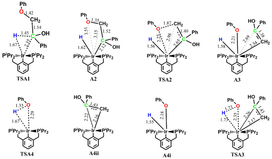 The optimized geometries of the stationary points, as well as the Gibbs free energy profile for the reaction of (iprPCP)Ir with 2-phenoxy-1-phenylethanol 1 along path A are shown in Figure 1 and Figure 2. All stationary points in the catalytic cycle were sought on both the singlet and triplet state potential energy surface (PES), but triplet-state energies were found to be highly unstable, with the reactants being 104 kcal mol−1 less stable on the triplet surface than on the singlet surface (Table 1).
