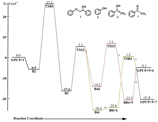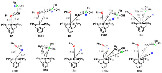 The optimized geometries of the stationary points, as well as the Gibbs free energy profile for the reaction of (iprPCP)Ir with 2-phenoxy-1-phenylethanol 1 along pathway B are shown in Figure 3 and Figure 4. Triplet-state energies obtained along this pathway were also found to be less stable than the singlet-state energies (Table 2). The reaction begins with the ether oxygen coordinating axially to the metal center, which is exergonic by −6.9 kcal mol−1, and a bond is formed between the Ir and O to give B2, which was not found to exist on the triplet surface. Subsequent addition of the β-carbon to Ir and cleavage of the ether C-O bond takes place with an activation energy barrier of 34.1 kcal mol−1.