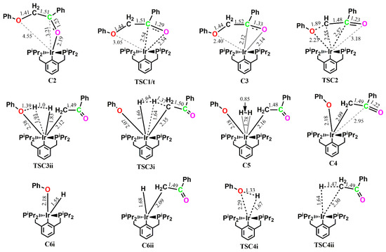 Optimized geometries of the main stationary points involved in the reaction of (iprPCP)Ir with 2-phenoxy-1-phenylethanol 1 along pathway C. Distances in Å.