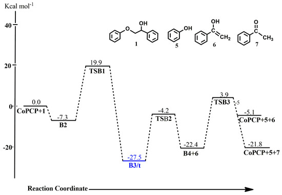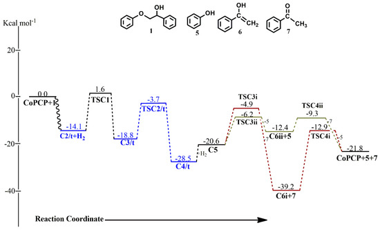 Figure 7, Figure 8, Figure 9, Figure 10, Figure 11 and Figure 12 show the optimized geometries as well as the Gibbs free energy profiles for the catalytic dehydroaryloxylation of 2-phenoxy-1-phenylehtanol 1 using (iprPCP)Co along pathways A, B and C, respectively. All stationary points have been sought on both the singlet and triplet potential energy surface as shown in Table 7, Table 8 and Table 9, with the triplet state reactants being 77.2 kcal mol−1 less stable than the singlet state reactants. Along pathway A, the (iprPCP)Co-catalyzed cleavage of 1 proceeds initially via C-H addition through TSA1 with an activation barrier of 13.9 kcal mol−1 to form A2, whereas C-O bond insertion follows via TSA2 with an activation barrier of 17.9 kcal mol−1. The abstracted hydrogen sits axially to the aromatic backbone of the pincer ligand in TSA1 but shifts to an equatorial position during the C-O bond cleavage, while the cleaved phenolate replaces it in the axial position in TSA2. It is found that the six-membered intermediate is not formed after the C-O bond cleavage occurs, as the enolate is released in this step with a reaction energy of 27.9 kcal mol−1 to form A3, containing only the phenoxide and the hydrogen ligand. The transition states for the C-H addition and C-O insertion, as well as the intermediate A2, were found not to exist on the triplet surface. Finally, reductive elimination of phenol 5 proceeds via TSA3 with an activation barrier of 26.3 kcal mol−1 leading to the regeneration of the catalyst. The formation of A3+[6+7] at −22.4 kcal mol−1 is the major resting state in the catalytic cycle, being only lower than the final products CoPCP +[5+7] by 0.6 kcal mol−1. On the triplet surface, the formation of A3 is endergonic by 24.1 kcal mol−1, making it less stable than the singlet state A3 by 46.5 kcal mol−1. These energies show that the major product formed from the iprPCPCo-catalyzed cleavage of a lignin β-O-4 compound is acetophenone and a two-state reactivity was not observed in the catalytic cycle.