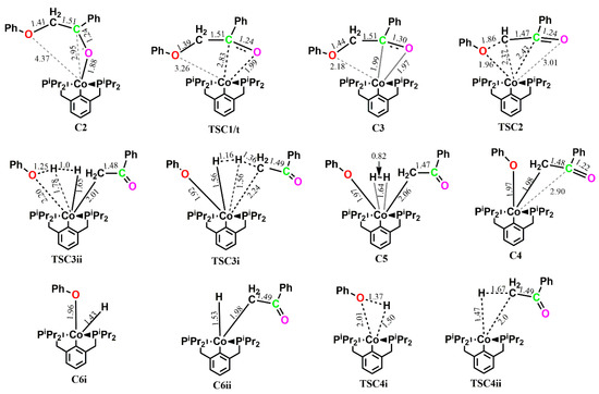 Optimized geometries of the main stationary points involved in the reaction of (iprPCP)Co with 2-phenoxy-1-phenylethanol 1 along pathway C. Distances in Å.