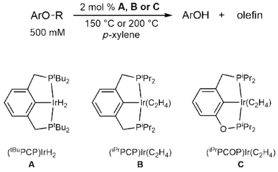These reports highlight some of the progress that has been made in addressing the challenges associated with the catalytic activation of sp3 C-O bonds, one of the primary linkages in organic chemistry. The activation of these types of C-O bonds is also a focus area of interest for the catalytic valorization of lignin to deoxygenated fuels and commercial chemicals. Lignin, which makes up 40% of the weight of biomass, is mostly comprised of alkyl aryl ether bonds that are difficult to break due to their strength and stability. Current research focuses on understanding how the β-O-4 linkage, which is the most abundant linkage in lignin, can be cleaved [11]. In 2014, Haibach et al. reported the dehydroaryloxylation of alkyl aryl ethers using PCP-type iridium complexes [12], making it the second report of this type of cleavage reaction being undertaken in a fully atom-economic fashion, following in investigations carried out by Bergman et al. [13] A previous study conducted by Haibach et al. on the formation of ether C-O bonds through the same PCP-type iridium-catalyzed olefin hydroaryloxylation [14] led to their 2014 investigation after they discovered that the catalyst could also carry out the reverse reaction, i.e., ‘ether dehydroaryloxylation’. From the optimization studies carried out by Haibach et al. [12], the use of less sterically bulky precursors (iprPCP)Ir A and (iprPCOP)Ir B (Scheme 2) was found to be beneficial as they led to much higher conversions.