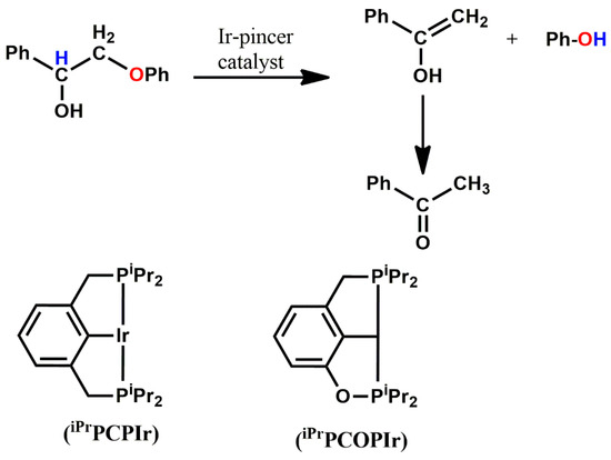 The following supporting information can be downloaded at https://www.mdpi.com/article/10.3390/catal13040757/s1, Table S1: Comparison between the M06 and M06-2X-D3 levels of theories calculated relative energies, activation energies and energies of formation for the IrPCP catalyzed cleavage of 2-Phenoxy-1-phenylethanol along Pathway A; Table S2: Comparison between the M06 and M06-2X-D3 levels of theories calculated relative energies, activation energies and energies of formation for the IrPCP catalyzed cleavage of 2-Phenoxy-1-phenylethanol along Pathway B; Table S3: Comparison between the M06 and M06-2X-D3 levels of theories calculated relative energies, activation energies and energies of formation for the IrPCP catalyzed cleavage of 2-Phenoxy-1-phenylethanol along Pathway C; S4: XYZ coordinates of the optimized structures.