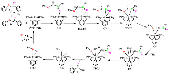 The third proposed reaction pathway, shown in Scheme 6, is similar to the mechanism proposed by Wu et al. [19] in their experimental study of the cleavage of a β-O-4 model compound using a Ru-xantphos catalyst. It begins with dehydrogenation of the substrate 2-phenoxy-1-phenyl-ethanol 1 to its corresponding ketone motif C2. C2 undergoes rearrangement via TSC1 to a slightly more stable adduct with a three-membered ring formed between the ketone carbon, the ketone oxygen and the Ir center. This is followed by the direct C-O bond insertion to form C4, which undergoes hydrogenation using the H2 generated earlier. The H2 molecule, which binds to the metal to form a dihydrogen complex C5, is used in the subsequent reductive elimination of phenol and acetophenone and the Ir-pincer catalyst is regenerated to repeat the catalytic cycle.