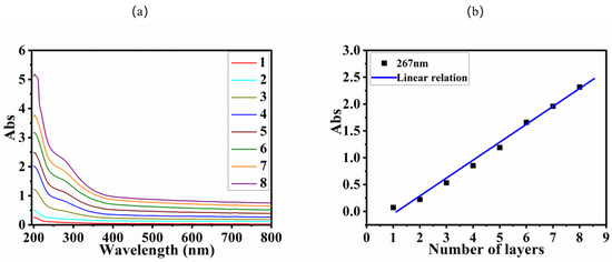 Compared with Figure 1b, the characteristic absorption band of Cu4P4W30 in Figure 3a did not change significantly during the process of assembling the film, suggesting that the electronic structure of Cu4P4W30 remained on the film. In addition, the UV-vis spectrum of PDDA-GO is shown in Figure S3. It can be seen that PDDA-GO displayed the absorption band at 230 nm and 300 nm. Comparing the UV-vis spectra of the composite films (Cu4P4W30/PDDA-GO)1–8 shown in Figure 3a with the UV-vis spectra of PDDA-GO and Cu4P4W30 in the solution, it can be seen that the absorption bands at ca. 200 nm and 267 nm of the composite films (Cu4P4W30/PDDA-GO)1–8 mainly arose from Cu4P4W30, while PDDA-GO did not show a significant influence in the studied wavelength region due to the small amount of PDDA-GO on the composite film.
