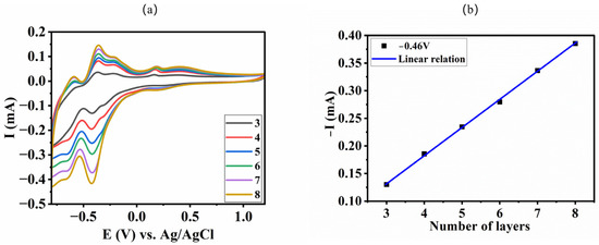 The effect of the layer number on electrocatalytic performance was investigated. For this purpose, a series of comparative experiments were carried out on the film (Cu4P4W30/PDDA-GO)n (n = 3–8)-modified electrode to find the optimal number of layers for the electrocatalytic reduction of 2,4-DNPH. It can be observed that as shown in Figure 8, the reduction currents of 10 μM 2,4-DNPH increased with the increase in the number of layers until the number of layers (n) was 7, while it decreased when n was 8. The possible reason for this observation is that the thickness of the film increases with the number of layers, while the electron exchange path from the film surface to the electrode surface becomes longer, which leads to the difficulty of electron transfer. Therefore, the optimal number of layers of the film-modified electrode is considered to be seven for the following sensing performance study.
