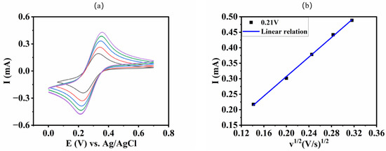 Using the LBL method, the film (Cu4P4W30/PDDA-GO)6 was fabricated on the surface of the ITO electrode to form the film-modified electrode. A series of CV curves at different scan rates from 20 to 100 mV·s−1 were measured using cyclic voltammetry in 1.0 mM [Fe(CN)6]3−/4− mixed solution containing 0.1 M KCl (see Figure 5). Based on the Randles–Sevcik Equation (1), the Aeff of the modified electrode was calculated from the relationship between Ip and v1/2 in the inset of Figure 5, giving 2.09 cm2 for the ITO/(Cu4P4W30/PDDA-GO)6 electrode. Comparing it with the geometric area of the bare ITO electrode immersed in the solution (1.2 cm2) indicates that the electrochemical active area of the ITO electrode increased after the modification of the film (Cu4P4W30/PDDA-GO)6.