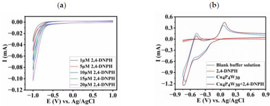 First, the CVs of bare ITO in different concentrations of 2,4-DNPH were recorded, as shown in Figure 6a; it can be seen that in the potential range of −1.0 V to 1.0 V, the currents of the reduction peaks at −1.0 V increased with the increase in 2,4-DNPH concentrations, but no obvious oxidation peaks were observed in the positive potential range from 0 to 1.0 V, indicating 2,4-DNPH can be electrochemically reduced at the bare ITO electrode at −1.0 V, but its metabolite cannot be oxidized at the bare ITO. Second, the CVs of the bare ITO in the blank solution, Cu4P4W30 solution (1.0 mM), 2,4-DNPH solution (10 μM) and the mixed solution of Cu4P4W30 (1.0 mM) and 2,4-DNPH (10 μM) were compared, as shown in Figure 6b; it is clearly noted that the reduction peak current of the W-O framework at −0.70 V increased, while the oxidation peak current of Cu at +0.06 V increase after adding 2,4-DNPH, clearly demonstrating the W-O framework catalyzed the reduction of 2,4-DNPH and Cu2+ catalyzed the oxidation of the 2,4-DNPH metabolite.