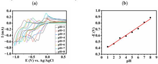 The effect of solution pH on the reduction peak potential of 2,4-DNPH was investigated in buffer solution containing 10 μM 2,4-DNPH at different pH values from 1 to 8. As shown in Figure 9, with the increase in the solution pH value, the potentials of the reduction peak of 2,4-DNPH moved to the negative direction, indicating the reduction of 2,4-DNPH was accompanied by proton involvement. The relationship between the pH values and the reduction peak potentials was obtained as E = −0.065 pH − 0.3427 (R2 = 0.988). It can be seen that the slope of 0.065 V/pH is close to the theoretical value of 0.059(m/n) V per pH based on the Nernst equation, in which m expresses the number of protons transferred and n represents the number of electrons participating in the electron transfer reaction. The value of m/n was calculated to be 1.1, indicating an electron transfer process involving equal numbers of protons and electrons. This observation is consistent with a report in the literature [1], where the authors demonstrated that 2,4-DNPH can be electrochemically reduced to 2,4-diamino-phenylhydrazine by six electrons and six protons participating in each nitro group. Then, the 2,4-DNPH metabolite was further oxidized to 2,4-diamino-phenylhydrazone, catalyzed by Cu2+ [40].