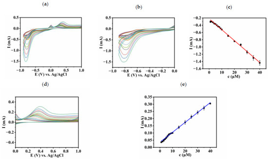 Figure 10 depicts the CV curves of the ITO/(Cu4P4W30/PDDA-GO)7 electrode in different concentrations of 2,4-DNPH (1–40 μm) in the potential range from −0.9 to 1.0 V. It can be clearly seen that the response currents gradually increased with the increase in the concentration of 2,4-DNPH. For clarity, the CVs in the potential range from 0 to −0.9 V and from 0 to 1.0 V are separately shown in Figure 10b,d, while the calibration curves for the detection of 2,4-DNPH and its metabolite are plotted in Figure 10c,e, which show different linear relationships between the catalytic currents and the concentrations of 2,4-DNPH. When the concentration range of 2,4-DNPH changed from 1 to 40 μm, the linear correlations were I (μA) = −30.2 c (μM) − 222 (R2 = 0.994) for the detection of 2,4-DNPH and I (μA) = 6.88 c (μM) + 36.25 (R2 = 0.992) for the detection of the 2,4-DNPH metabolite, respectively. Furthermore, the limit of detection (LOD) [41] of the prepared sensor ITO/(Cu4P4W30/PDDA-GO)7 was calculated to be 35.6 nM for the detection of 2,4-DNPH based on signal-to-noise ratio 3 (S/N = 3). Then, the obtained result was compared with reported LOD values obtained using other detection methods in the literature; it can be seen from Table 1 that the developed sensor achieved a good sensing performance. Moreover, the proposed sensor was simply prepared at a low cost and showed a two-way electrochemical sensing performance for the detection of 2,4-DNPH and its metabolite.