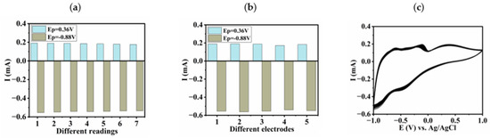 Stability, reproducibility, and repeatability are very important indexes to evaluate the performance of electrochemical sensors in the sensing process. To determine whether the sensor response of the ITO/(Cu4P4W30/PDDA-GO)7 electrode to 2,4-DNPH was reproducible, seven consecutive readings were taken in 10 μM 2,4-DNPH at pH 7 using the same electrode. As shown in Figure 11a, the results indicate that the relative standard deviation (RSD) of the peak currents was 1.23% for the reduction peak at −0.88 V and 2.60% for the oxidation peak at 0.36 V, meaning that the sensor prepared for the detection of 2,4-DNPH had good reproducibility. Furthermore, the repeatability of the ITO/(Cu4P4W30/PDDA-GO)7 electrode was evaluated using five different electrodes prepared within five days, and their response currents to 10 μM 2,4-DNPH at pH 7 was recorded (shown in Figure 11b), giving RSDs of 2.45% for the reduction peak at −0.88V and 3.01% for the oxidation peak at 0.36 V, implying that the ITO/(Cu4P4W30/PDDA-GO)7 electrode had good repeatability. Finally, the operational stability of the ITO/(Cu4P4W30/PDDA-GO)7 electrode was tested by scanning 100 cycles continuously in 10 μM 2,4-DNPH at pH 7; the corresponding CVs are shown Figure 10c, showing that the peak current remained at about 90.9% of the initial value after scanning 100 cycles, which proves that the ITO/(Cu4P4W30/PDDA-GO)7 electrode possessed good stability. Based on the above observation, it can be concluded that the proposed ITO/(Cu4P4W30/PDDA-GO)7 electrode could be used as a stable, reproducible, and repeatable electrochemical sensor for the detection of 2,4-DNPH and its metabolite.