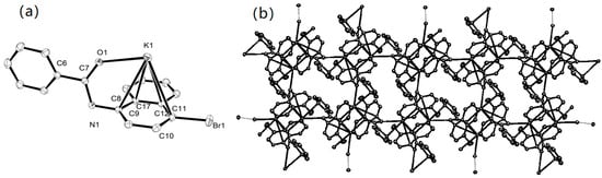 The single crystal of K2 and the single crystal of K10 were obtained by laying n-hexane to their THF solution, and their structures were shown in Figure 1 and Figure 2. The selected bond lengths and bond angles are shown in Table 1 and Table 2. The crystal structure showed that there was a strong interaction between the K center with Aryl(N) from another molecular, which was clearly demonstrated by the bond distances [3.149–3.496 Å] of C8-K, C9-K, C11-K, C12-K, and C17-K. As shown in Figure 1, due to the interaction between the potassium with the carbon of aryl from another aryl ring, each potassium was high-coordinated by arene, one Caryl, and N from another amidate; this type of alkali metal-π interaction has been reported in the literature on the topic several times []. Therefore, the molecules were packed in two-dimensional form, generating a polymeric structure (Figure 1b).