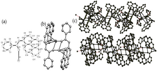 (a) Ortep drawing of structure of K10, with ellipsoids shown at the 30% probability level (left). (b) Mercury drawing dimer of K10 through interaction (middle). (c) A section of the packing diagram in K10 (right).