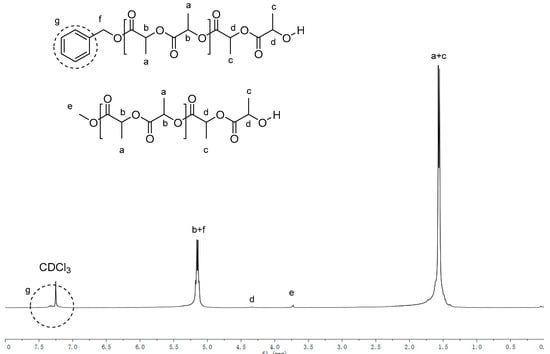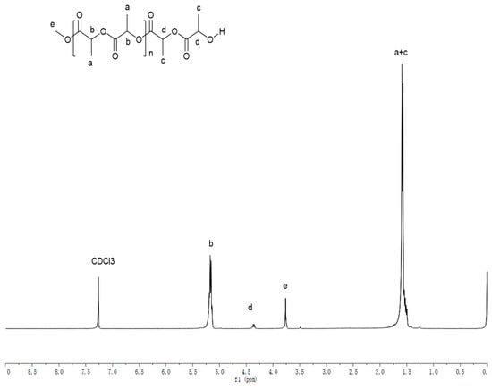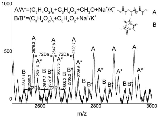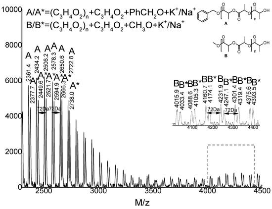 In order to obtain more information about the mechanism of L-lactide polymerization, the end group of PLLA catalyzed by K2 was analyzed by using 1H NMR and Matrix-Assisted Laser Desorption/Ionization Time of Flight Mass Spectrometry (MALDI-TOF spectrometry). When BnOH was not used, the MALDI-TOF analysis of PLLA showed that the polymer had two structural compositions, A and B, in which the peak A series can be attributed to linear (C3H4O2) n + C3H4O2 + CH3OH+ Na+/K+, while B can be classified as cyclic (C3H4O2)n + C3H4O2 + Na+/K+ (Figure 3). The interval between the peaks of the two series were 72 Da, which is the molecular weight of half lactide, indicating that the transesterification reaction occurred during the ring-opening polymerization. At the same time, the 1H NMR spectra of the polymer showed a significant -OCH3 signal (as shown in Figure 4), which was consistent with the results of MALDI-TOF. The methoxyl group may come from the quenching solvent of methanol [].