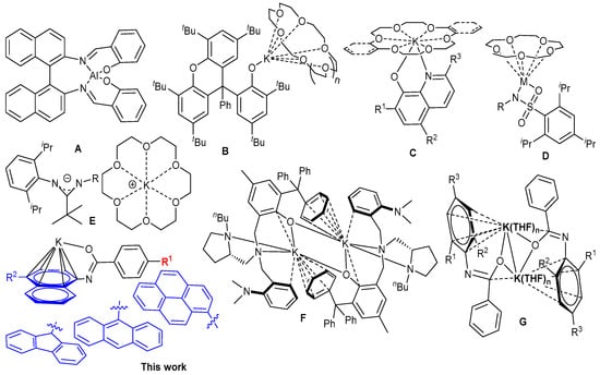 In recent years, the isoselective ROP of rac-lactides using crown ether alkali metal complexes have made great progress [,,,,,,]. For example, the crown ether alkali metal complexes B (Scheme 1) have shown good efficiency in the ROP of rac-lactide, affording isotactic-enriched polylactide (PLA) []. Although quinolin-8-olate ligands exerted a relatively low degree of steric hindrance, the catalysts C still maintained stereoselective polymerization in toluene at room temperature or 0 °C, with the Pm ranging from 0.66 to 0.75 []. Moreover, the isoselectivity can also reach the high value of Pm = 0.84 by using complexes D []. Ion-paired potassium amidinate complexes E were able to efficiently catalyze the ROP of rac-lactide at low temperature, and the isoselectivity reached its highest value of Pm = 0.88 at −70 °C []. These results imply that alkali metal complexes show great potential for realizing the goal of the highly active and highly stereoselective ROP of rac-lactide. In addition, a series of potassium complexes F could initiate the polymerization of rac-LA to achieve high monomer conversions within several minutes in the presence of iPrOH, but it afforded atactic PLA with slightly isotactic-enriched microstructures []. Our group developed a family of sodium 2-arylimino-8-quinolates complexes that have shown good activity toward the ring-opening polymerization (ROP) of rac-lactide but without selectivity []. Recently, our group reported a series of simple potassium amidate complexes G that showed good efficiency for the ROP of L-lactides []. Some crystal structures, especially, clearly showed π interactions of the aryl with the K atom, resembling “CpM”, a sandwich form (Cp: cyclopentyl, M: metal). At the same time, the crown ether alkali metal complexes can also be regarded as “CpM” due to the similar role of the crown ether in the “Cp”. Considering the potentially important role of the “Cp” group, in this paper, a series of potassium amidates with larger conjugated aryls were designed and evaluated for the ROP of L-lactides and rac-lactide. The crystal structure showed π interactions between the K and the aryl ring, and some complexes showed good activity and stereoselectivity for the ROP of rac-lactide. These details are discussed further in this work.