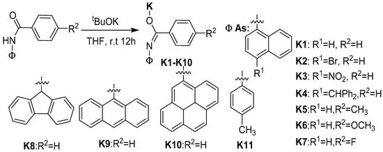 A series of benzamide containing polycyclic aryls, L1–L10, were readily prepared by the reaction of the corresponding arylamines with benzoyl chloride. Compounds L1–L10 have not been reported before and hence full details of synthesis were shown in the experimental section. Treatment of L1–L10 with 2 equivalents of potassium tert-butoxide (KOtBu) at ambient temperature in THF afforded the corresponding potassium complexes as solid with a good yield (Scheme 2). All complexes were characterized by 1H/13C NMR spectroscopy (showed in Figures S1–S10). As a matter of course, the NMR spectra of the complexes were recorded in d6-DMSO because their solutions in other solvents proved to be unstable (CDCl3 and d6-benzene). The absence of a -NH signal (around δ 10.0) in their 1H NMR spectra gave support for the full conversion of L1–L10 to K1–K10 (K11 was prepared according to the literature []).