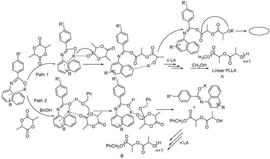 Collectively, the results observed using K2 in the L-LA polymerizations that are described above suggest that two mechanisms were involved (as shown in Scheme 3), similar to previous reports [,,,,]. One is that the K2 directly initiate the ring-opening polymerization of L-LA, in which the CH3O- end group originated from the methanol used to terminate the polymerization. Conversely, the other one followed the “monomer activated mechanism (BnOH)” seen for most alkali metal systems [,,], in which L-LA can be activated following coordination to the metal center and is then ring-opened via the nucleophilic attack of the benzyl alkoxide. When more BnOH was employed in the catalytic system, polymerizations preferred to proceed in Path 2, producing the linear PLLA (B/B* family).