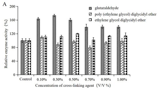 After adsorption, we added glutaraldehyde, ethylene glycol diglycidyl ether, and poly (ethylene glycol) diglycidyl ether, respectively. Six concentration gradients of 0.1%, 0.3%, 0.5%, 0.7%, 0.9%, and 1.0% (v/v) were set for each cross-linking agent. The cross-linking was carried out on a temperature-controlled shaking table at 37 °C, and it was shook at 700 rpm for 4 h. After the reaction was completed, it was filtered and washed with 50 mM PBS buffer solution with pH of 6.8 to obtain the immobilized enzyme, dried overnight at room temperature to remove most of the water, and placed in the incubator at 37 °C for 4 h to remove the remaining water, detect the enzyme activities of different immobilized enzymes, screen the appropriate cross-linking agent, and determine the concentration of the cross-linking agent.